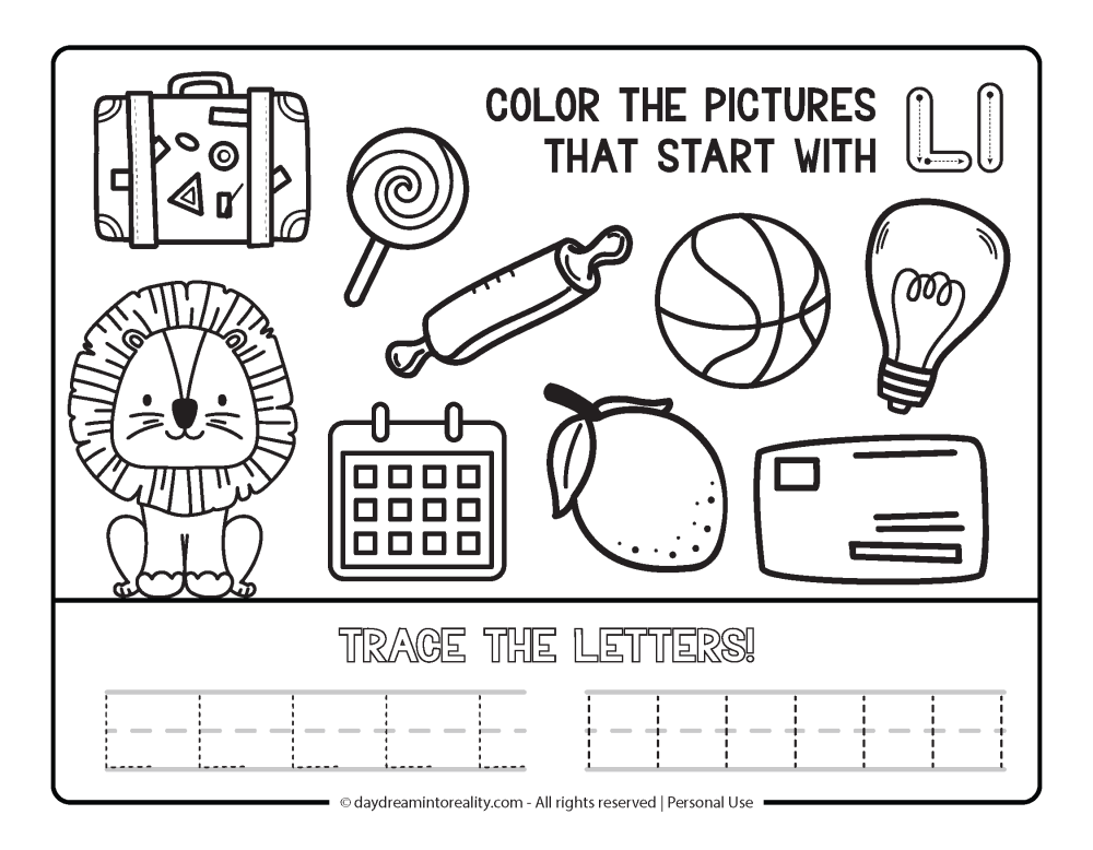Target words: leaf, lightbulb, lion, lemon, lock, lollipop, lamp.