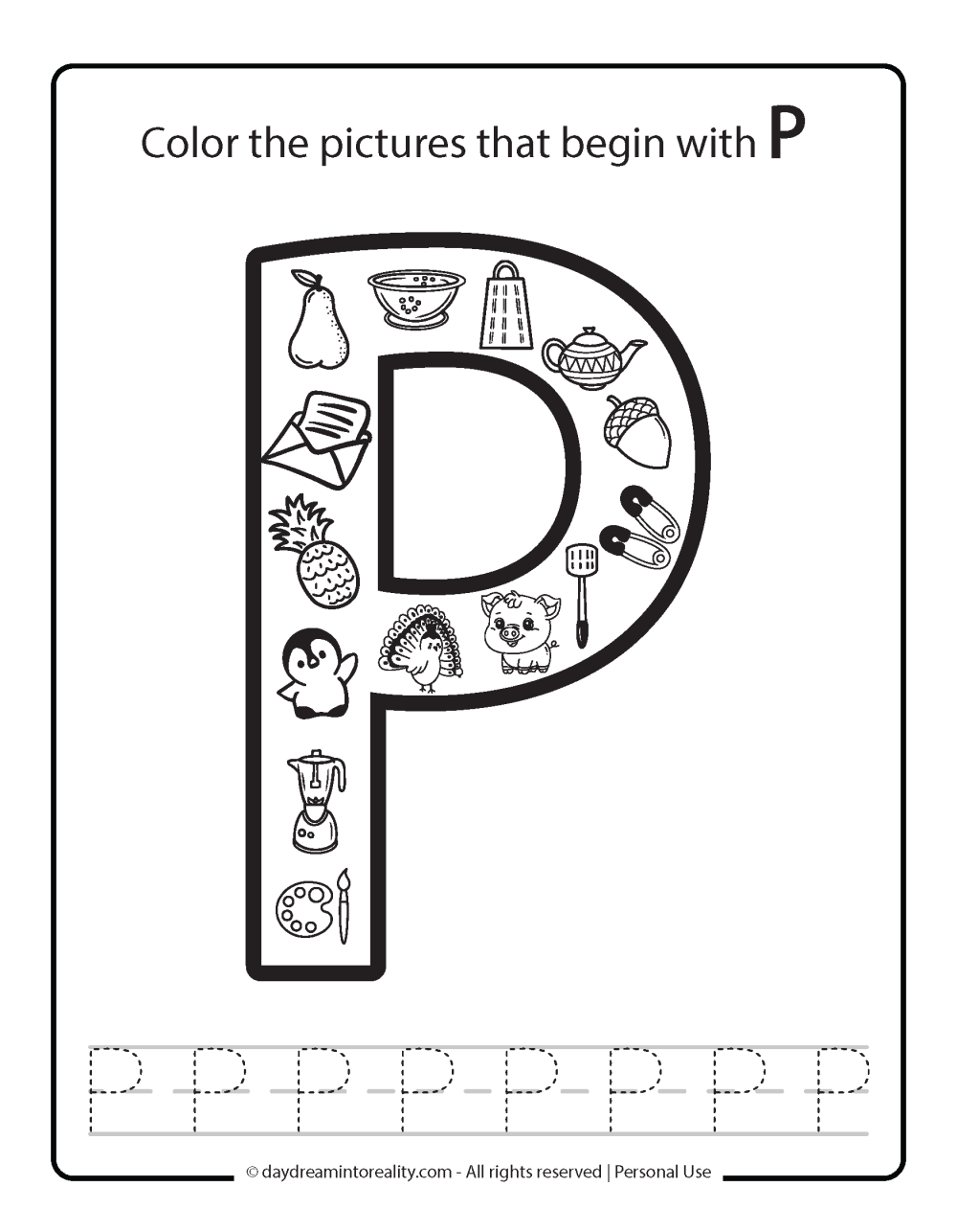 Target words: pear, pin, pig, penguin, paint/paintbrush, popsicle, pizza, palm tree, piano.