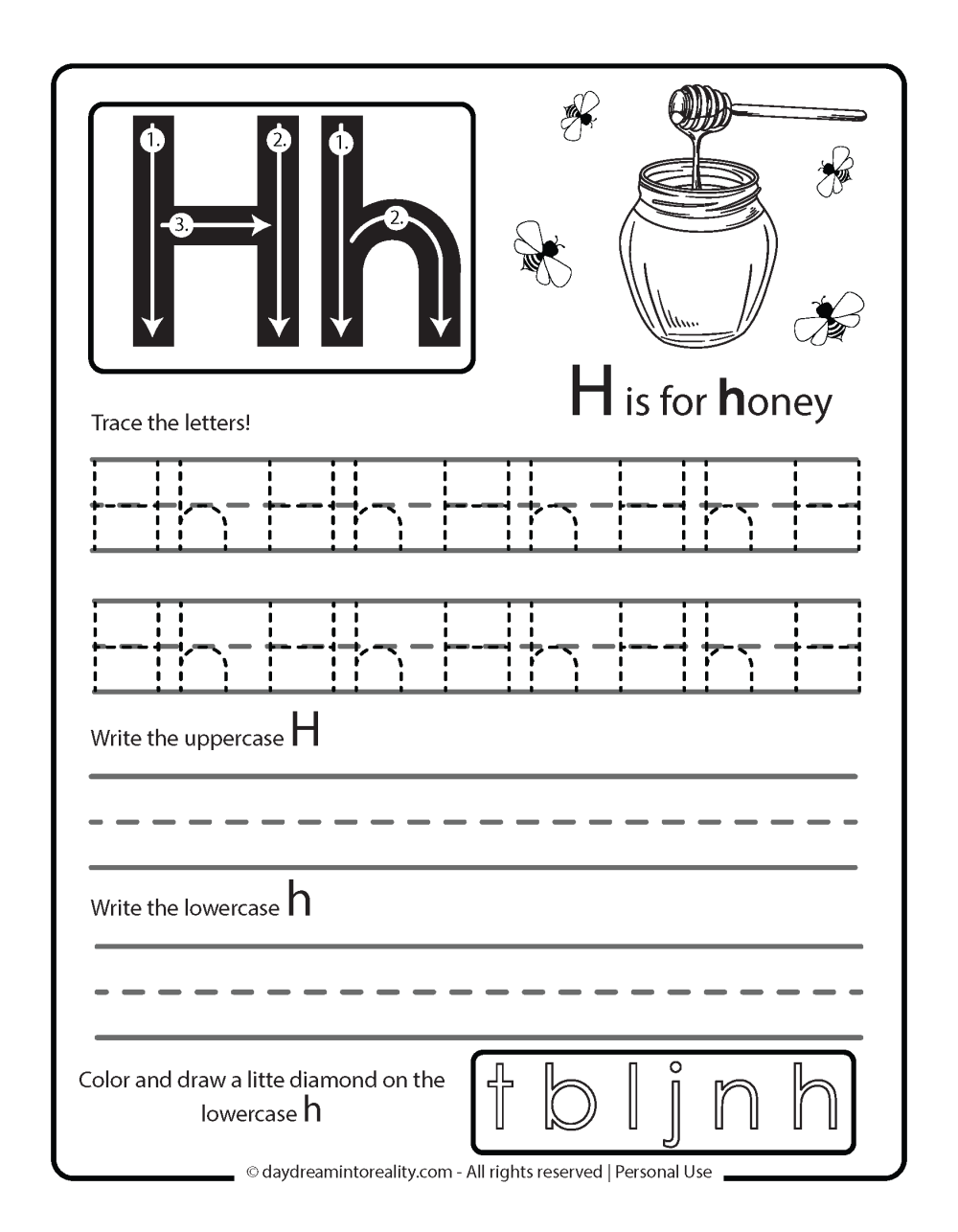 Let’s start by practicing writing the uppercase and lowercase letter “H” with the “Letter H – Writing Practice Sheets.”